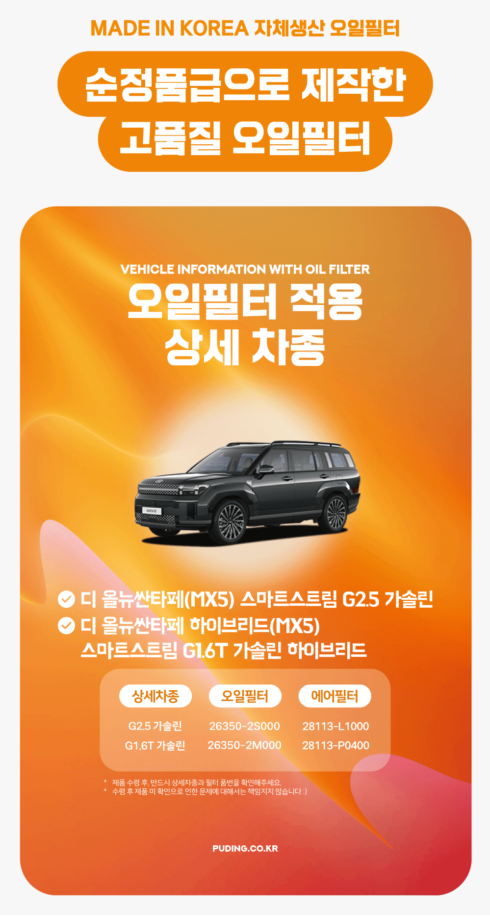 푸딩에서 고품질 오일필터를 저렴하게 교체해보세요! (MADE IN KOREA 자체생산)