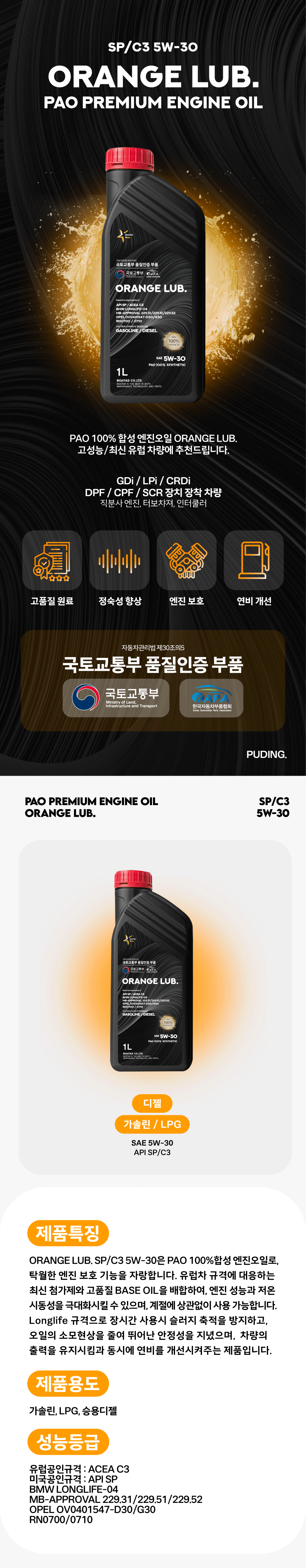 [가솔린/디젤] 푸딩 100%합성유 엔진오일 ORANGE LUB. PAO 1박스(12개입)